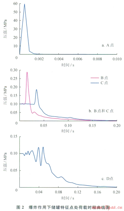 儲(chǔ)罐各特征點(diǎn)處在爆炸作用下的荷載時(shí)程曲線如圖2所示,由于E、F兩點(diǎn)距離爆心較遠(yuǎn),其超壓現(xiàn)象不明顯,本文并未示出這兩點(diǎn)的相應(yīng)曲線。比較前3個(gè)特征點(diǎn)的荷載時(shí)程曲線,其極值分別為59.15MPa0.28MPa0.18MPa;峰值出現(xiàn)時(shí)間分別為0.5ms、15.1ms35ms;正壓區(qū)作用時(shí)間分別為2ms、8ms10.5ms。本文參考文獻(xiàn)[14]中給出了裝藥密度為1630kgm3時(shí)TNT炸藥所形成空氣沖擊波的初始值,其初始波后壓力為54.35MPa,傳播速度為6450m/s