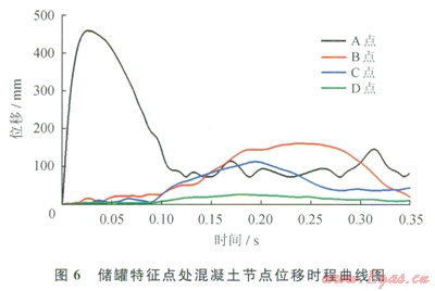 6為儲(chǔ)罐特征點(diǎn)AD處混凝土節(jié)點(diǎn)位移時(shí)程曲線,EF兩處位移響應(yīng)較小,此處未予列出。從圖6中可以看出,A點(diǎn)穹頂處最大位移達(dá)到了458mm,出現(xiàn)在25ms左右,說(shuō)明穹頂處變形并不是在爆炸瞬間達(dá)到了最大位移響應(yīng),而是有一個(gè)逐漸變形的過(guò)程,最后其變形維持在100mm左右波動(dòng),證明穹頂各處發(fā)生了不可恢復(fù)變形,即穹頂混凝土已經(jīng)發(fā)生塑性破壞。B、C、D 3處的最大變形分別為164mm、113mm27mm,各處均存在不同程度的殘余變形,但其值均較小,不影響結(jié)構(gòu)的整體安全。現(xiàn)行國(guó)外規(guī)范并未對(duì)穹頂撓度限制有詳細(xì)規(guī)定,參考我國(guó)《混凝土結(jié)構(gòu)設(shè)計(jì)規(guī)范》[17]中的規(guī)定,穹頂處撓度限制應(yīng)小于l0400,即80000400200mm。從以上分析中可以看出,穹頂處撓度已超過(guò)該值,雖未引起破壞,但結(jié)合其他數(shù)據(jù)可以看出基本已達(dá)到其承載力極限。