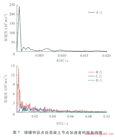 7為儲(chǔ)罐特征點(diǎn)AD處混凝土節(jié)點(diǎn)加速度時(shí)程曲線。由圖7可見(jiàn),各點(diǎn)加速度峰值均出現(xiàn)在初始加載階段,而后反應(yīng)大幅下降,并伴有鋸齒形劇烈振蕩,振蕩現(xiàn)象隨著爆心距的增加而愈加劇烈。這一現(xiàn)象的原因?yàn)檎ㄋ幈ê蠼o儲(chǔ)罐穹頂一個(gè)極大的初始加速度荷載,引起各特征點(diǎn)處加速度出現(xiàn)一個(gè)脈沖峰值,而后出現(xiàn)的鋸齒形振蕩則是由儲(chǔ)罐的自振引起的。將圖57與圖2的荷載時(shí)程曲線相對(duì)比,叮以看出,沖擊波波陣面的傳播對(duì)混凝土單元的應(yīng)力影響很大,但對(duì)于其加速度響應(yīng)影響不大。以C點(diǎn)為例,其荷載峰值出現(xiàn)在35ms處,此時(shí)其相應(yīng)的應(yīng)力出現(xiàn)了一個(gè)脈沖峰值,而其加速度響應(yīng)未有明顯波動(dòng)。