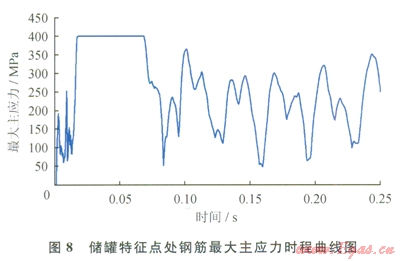 儲(chǔ)罐部分特征點(diǎn)B處鋼筋最大主應(yīng)力時(shí)程曲線如圖8所示,由于爆心處A點(diǎn)的鋼筋瞬間即達(dá)到設(shè)定的應(yīng)變極限不具代表性,故此處并未示出。圖8顯示B點(diǎn)的鋼筋一直處于較高的應(yīng)力水平,最大應(yīng)力已達(dá)到400MPa,但是未達(dá)到設(shè)置的應(yīng)變極限0.05,故尚未破壞,初始爆炸沖量并未使其到達(dá)應(yīng)力極值,后續(xù)的空氣沖擊波持續(xù)作用使其應(yīng)力逐漸增加。外罐鋼筋除爆心處發(fā)生破壞外,其余部分即使有瞬間到達(dá)應(yīng)力限值,但未達(dá)到設(shè)定的應(yīng)變極限,總體來(lái)說(shuō),外罐鋼筋應(yīng)力響應(yīng)較安全。
