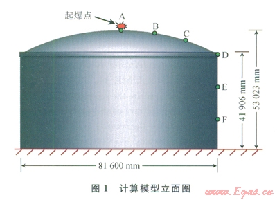 筆者應(yīng)用流固耦合AKE算法和LS-DYNA有限元程序?qū)佑|爆炸作用下特大型LNG儲(chǔ)罐的動(dòng)力響應(yīng)進(jìn)行了數(shù)值模擬分析,根據(jù)前期工作分析,選取900kg TNT當(dāng)量炸藥作為分析載荷。計(jì)算結(jié)果表明: