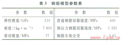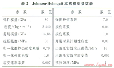 混凝土采用Johnson-Holmquit本構(gòu)模型,模型參數(shù)見(jiàn)表2。該模型因綜合考慮了損傷、應(yīng)變率、靜水壓以及壓碎、壓實(shí)效應(yīng),適合大應(yīng)變、高應(yīng)變率和高靜水壓情況,被廣泛地應(yīng)用于混凝土撞擊、侵徹和爆炸等強(qiáng)動(dòng)載問(wèn)題的數(shù)值模擬。鋼筋材料模型采用雙線性隨動(dòng)硬化模型,用兩個(gè)斜率(彈性和塑性)來(lái)表示鋼筋的應(yīng)力應(yīng)變特性,具體參數(shù)見(jiàn)表3。