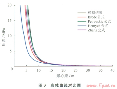 1)本文模擬過(guò)程中沖擊波荷載的峰值和衰減曲線與4種經(jīng)驗(yàn)公式基本一致,滿(mǎn)足工程精度要求。