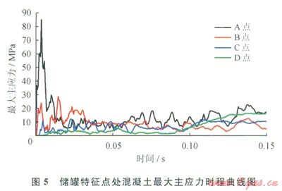 C點(diǎn)在4.5ms時(shí)也出現(xiàn)了一個(gè)l0.7MPa的脈沖峰值,原因同上;在24.8ms出現(xiàn)一個(gè)ll.9MPa的峰值響應(yīng),是由于空氣沖擊波波陣面?zhèn)鞑サ?span lang="EN-US">C點(diǎn)所致,其后應(yīng)力急劇下降并伴有高頻鋸齒振蕩[16]。從圖5中可以看出D點(diǎn)在80ms以前應(yīng)力持續(xù)小幅振蕩,80ms以后為大幅低頻響應(yīng),如31節(jié)中所述,這一現(xiàn)象與其特殊的位置和構(gòu)造有關(guān),爆炸沖擊波在此處連續(xù)作用于罐體,導(dǎo)致罐體疲勞損傷。總體來(lái)說(shuō),A、B點(diǎn)雖未發(fā)生破壞,但均已處于較高的應(yīng)力水平,C點(diǎn)至F點(diǎn)混凝土的應(yīng)力響應(yīng)均在安全范圍之內(nèi),這也印證了前述900kg當(dāng)量為罐體抗爆極限值的結(jié)論。