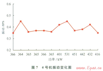 在10口井的試驗中,GTI混合燃料技術(shù)基本能滿足各個工況下鉆機對柴油機動力的需求,對突加負荷的滿足能力較強,當運行參數(shù)超過設(shè)定的安全值,能立即平穩(wěn)地轉(zhuǎn)為純柴油模式,保證動力供給的連續(xù)性。起下鉆工況下,4號柴油機最低排溫511℃,最高排溫576℃,均在安全范圍內(nèi)。其排溫曲線和振動變化如圖6、7所示。