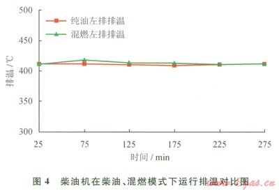 柴油機組在混合燃料狀態(tài)運行時,機組運行的各項參數(shù)與柴油機標定參數(shù)相近,在啟動、關(guān)閉等過程,發(fā)動機運行平穩(wěn),無異常。當負荷過低時,機組混燃模式下的排溫略高于純柴油模式,但仍在安全范圍以內(nèi),不對柴油機組的運行造成影響。