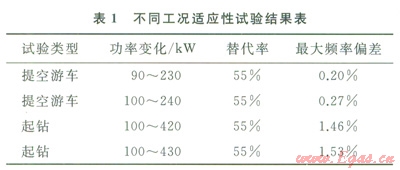 3)提空游車適用性試驗結(jié)果分析。試驗井深4000m,單機功率從l00kW突加至230kW,發(fā)電機組在雙燃料模式下頻率波動0.2%,相對于柴油模式0.2%的頻率波動,無影響。起鉆試驗單機功率從l00kW突加至430kW,發(fā)電機組在雙燃料模式下頻率波動1.53%,相對于柴油模式1.2%的頻率波動有所增加,但不影響鉆井工作,試驗結(jié)果如表1所示。