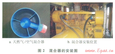 天然氣經(jīng)過安裝在柴油機空氣過濾器和渦輪增壓器之間的混合器進入氣缸參與燃燒,經(jīng)改造后的混合燃料發(fā)動機能維持柴油機相同的性能?;旌先剂习l(fā)動機可以在100%柴油模式和混合燃料模式之間自由切換,并且維持轉(zhuǎn)速和負荷不變。