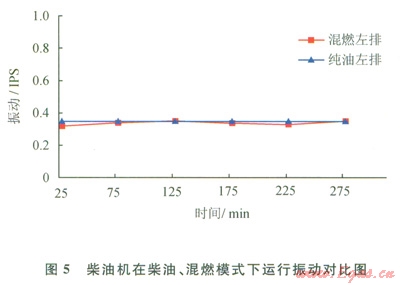 2)排溫和振動試驗分析。試驗功率為450kw,柴油機在柴油、混燃模式下運行300min(替代率33.81%),排溫和振動[8-10]試驗結(jié)果相差不大(圖4、5)。
