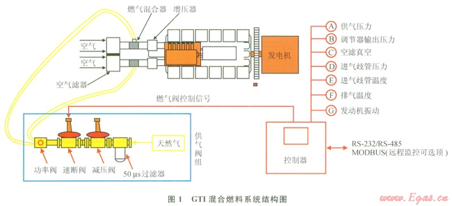 GTI混合燃料技術(shù)是利用美國Altronic公司生產(chǎn)的GTI混合燃料系統(tǒng)對柴油機進行改造的技術(shù)[1]。經(jīng)GTI混合燃料技術(shù)改造的混合燃料發(fā)電機組,能夠同時燃燒柴油和天然氣。被改造的機組在啟動和怠速時按純柴油工作方式運行,達到混燃條件后進入混合燃料運行模式。GTI混合燃料控制系統(tǒng)允許原柴油機監(jiān)控系統(tǒng)控制柴油機的轉(zhuǎn)速,在恒定的負載下,由于額外吸入了天然氣,柴油機燃料超出需要,柴油機的轉(zhuǎn)速輕微增加,為了保持熱值平衡和設(shè)定的轉(zhuǎn)速,監(jiān)控器會迅速調(diào)節(jié)減少噴油量,從而實現(xiàn)天然氣對柴油的替代。反之,當已達平衡狀態(tài)后天然氣供給減少時,柴油機監(jiān)控器會迅速實時動態(tài)地調(diào)節(jié)噴油量,建立新的燃油供給平衡,保持設(shè)定轉(zhuǎn)速,維持柴油機正常運行。
