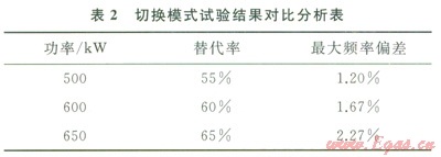 4)切換模式對比分析。分別在500kW、600kW和650kW 3種工況下,進行天然氣切斷時的響應(yīng)測試,最大頻率偏差2.27%,小于國家標準5%。分別在500kW(替代率55%)、600kW(替代率60%)和650kW(替代率65%)工況下,GTI機組頻率增加均沒有超過l%。試驗結(jié)果表2所示。