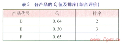 根據(jù)計算得到的Ci值大小進(jìn)行排序,Ci值越大,越接近于l,說明越接近于最優(yōu)方案,產(chǎn)品綜合評價越優(yōu)。經(jīng)計算得到各產(chǎn)品的Ci值,其排序見表3