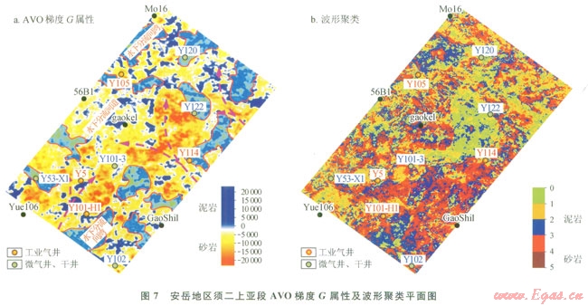 圖7-a反映了該區(qū)須二上亞段AVO梯度G屬性的平面展布特征,根據單井對比,圖中紅黃色代表水下分流河道的高孔砂巖,藍色代表水下分流間灣,以泥巖為主;圖7-b為波形聚類平面圖,反映了區(qū)內須二上亞段(頂、底界20~30ms時窗范圍)地震波形變化特征,該波形變化表征了砂、泥巖橫向變化規(guī)律。圖中,紅、綠色代表高孔砂巖,藍色代表泥巖。