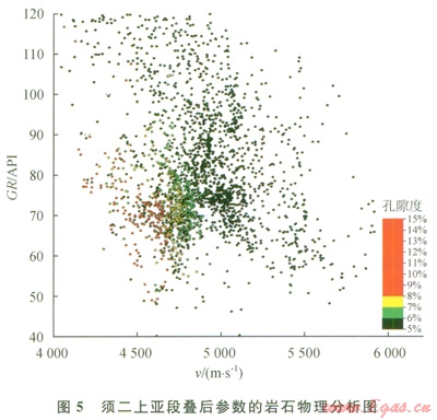 安岳地區(qū)須二上亞段主要為高孔砂巖、致密砂巖和泥巖,從疊后參數的巖石物理分析結果看,伽馬、速度、孔隙度各類樣點值分散、疊置,常規(guī)屬性難以區(qū)分出高孔砂巖(圖5)。