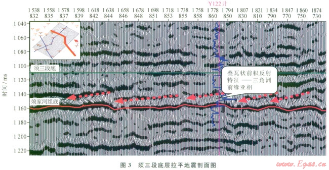 地震相主要是通過地震反射外部幾何形態(tài)、內部反射結構、振幅、連續(xù)性、波形排列以及視頻率等特征進行識別與劃分。在區(qū)域最大湖泛面(須三段底)拉平地震剖面上,對于整個須二段可見清晰的三角洲前緣亞相疊瓦狀前積反射結構,兩個平行的反射層之間存在幾組傾斜的、疊瓦狀排列的同相軸(圖3),可作為判斷物源方向的依據。但對該區(qū)須二上亞段20~30ms小時窗內(厚度50~85m),地震微相特征不明顯,后續(xù)沉積微相的劃分需要借助地震屬性的分析。