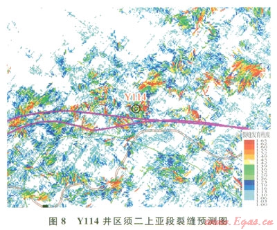 結合鉆井測試資料驗證性分析(圖7),工業(yè)氣井主要分布在以高孔砂巖為主的水下分流河道,微氣井或干井主要分布于以泥巖為主的水下分流間灣,地震預測與鉆井成果吻合較好。僅Yll4井位于水下分流間灣,但該井在須二上亞段產工業(yè)氣流,究其原因:①鄰近水下分流河道;②該區(qū)儲層為裂縫孔隙型,鉆井產能的高低與高孔砂巖及裂縫的發(fā)育程度均密切相關,針對井區(qū)地震裂縫預測結果顯示,該層段裂縫發(fā)育,提高了儲層滲流能力(圖8)。