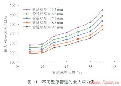 3)以上工況,把管道壁厚分別改變?yōu)?span lang="EN-US">15.5mm、16.5mm、18.5mm、19.5mm,計(jì)算管道最大Mises應(yīng)力的變化情況(圖11),最大Mises應(yīng)力隨壁厚的增加而下降,安全裕度隨壁厚增加而升高。為此,管道壁厚的增加量不能太大,若壁厚過(guò)大,為保持管道質(zhì)量不變,必須減少管徑,這會(huì)影響管道輸量;若要保持管道內(nèi)徑不變,壁厚增加太多,勢(shì)必使單位管段的耗材和質(zhì)量劇增,以至管道豎向受力增大。本文僅對(duì)管道壁厚作適度調(diào)整以觀察受力與管材結(jié)構(gòu)變化的關(guān)聯(lián)性,為碳纖維強(qiáng)固提供理論依據(jù)。碳纖維質(zhì)量小于鋼管,自身抗拉能力強(qiáng),對(duì)擘厚影響較小,這些特點(diǎn)可滿足上述分析的需要:即重量變動(dòng)不大、適當(dāng)改變材料組成及結(jié)構(gòu)、提高抗彎能力。