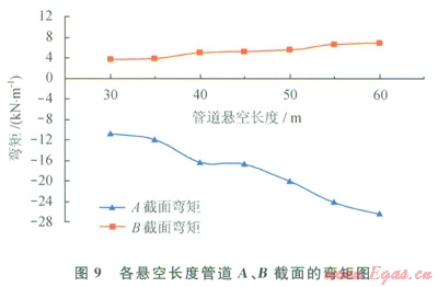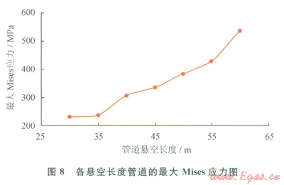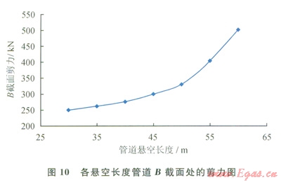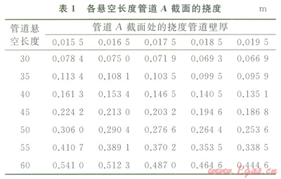 2)保持其他工況參數(shù)不變,改變懸空長(zhǎng)度分別為35m、40m、45m、50m、55m、60m時(shí),汁算管道最大應(yīng)力、彎矩和撓度(見(jiàn)圖8~10和表l)??梢?jiàn):截面A處撓度最大,截面B處剪力最大,管道易在截面B處發(fā)生剪力破壞。當(dāng)懸空長(zhǎng)度為55m時(shí),管道已接近失效上限,仍處于安全范圍。60m時(shí),管道最大應(yīng)力大于485MPa,此時(shí)管道失穩(wěn),超出安全極限,理論上已失效。