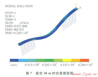 懸空30m時(shí),仿真結(jié)果如圖7,在沿管軸方向(圖中x方向)的對(duì)稱中心處管道變形位移最大,在兩固支端、埋地與懸空的過(guò)渡處、對(duì)稱中心處應(yīng)力集中較明顯,沿豎直方向(圖7中y方向)管道上部應(yīng)力集中比管道下部明顯,最大應(yīng)力為230MPa,小于屈服極限485MPa,所以管道處于安全范圍內(nèi)。
