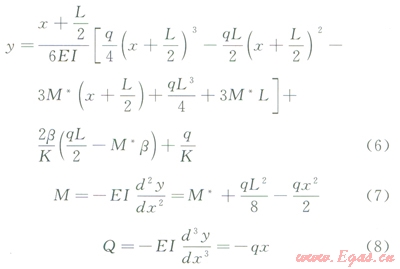 懸空段L:受埋地段兩端的拉伸、懸空與埋地過(guò)渡處下滑土的剪切、輸送介質(zhì)重量和管道白重等力的作用。通過(guò)力學(xué)等效簡(jiǎn)化,該段為當(dāng)量軸向力(S0,)、彎矩(M0),剪力(Q0)、上部均布載荷(q)作用的大撓度梁。