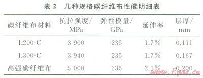 纖維強(qiáng)固材料(Fiber Reinforced Plastics,FRP)括:碳纖維(CFRP)、玻璃纖維(GFRP)和芳綸纖維(AFRP),碳纖維平均抗拉強(qiáng)度為4210MPa(相當(dāng)于碳素鋼的l0倍),平均彈性模量為235×109MPa(與鋼材接近),熱膨脹系數(shù)與鋼材相仿,耐腐蝕、抗老化、耐溫、抗蠕變能力較好,且厚度小、質(zhì)量輕、層間剪切力高、穩(wěn)定性好、纏繞方式靈活易操作,大量應(yīng)用于航天、兵器、建筑和化工領(lǐng)域,表2列舉了3種碳纖維布[11]性能。