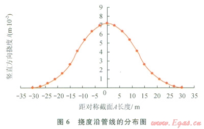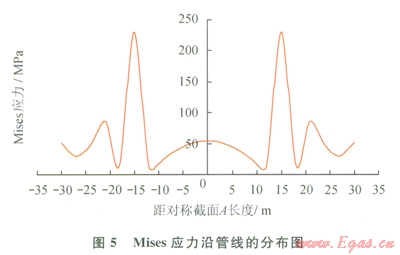 1)圖5、6表示了現(xiàn)場(chǎng)實(shí)際懸空長(zhǎng)度為30m時(shí),應(yīng)力和撓度沿管線的分布情況,可見(jiàn)Mises應(yīng)力和豎直方向應(yīng)力在±15m處最大,而最大撓度出現(xiàn)在模型C-C處,也就是懸空水平對(duì)稱處。