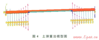 建立有限元物理模型時(shí),將埋地管段所受到土壤支反力用一定間距的若干根彈簧代替,彈簧與管下表面呈點(diǎn)一面接觸。合理選取埋地管段長(zhǎng)度,使管模型兩端不受懸空段的影響,從而實(shí)現(xiàn)管兩端的固支模型,一般工程上取單側(cè)埋地段長(zhǎng)度為懸空段長(zhǎng)度的l/2,這時(shí)管兩端可近似為固支[10](圖4)。