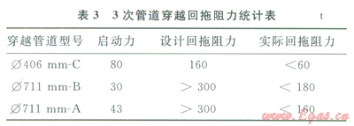 3)回拖階段,采用了新型地錨,保證了回拖施工的安全。采用漂管施工,降低了回拖阻力。外防腐層增加了新型玻璃鋼防腐技術,有效地保護了防腐層。經過一系列技術創(chuàng)新,大大降低了回拖阻力,使得回拖施工順利完成。