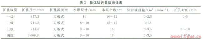 2)擴孔階段,采用了新型Æ168.3mm(V-150)鉆桿,改進了擴孔器類型,優(yōu)化了水力參數,成功完成了擴孔施工,極大地提高了擴孔效率。