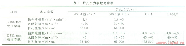 Æ406mm管道穿越擴孔施工時發(fā)現鉆井液排量低于2m2/min、水眼射速低于50m/s時擴孔扭矩大,鉆具磨損快。Æ711mm管道穿越擴孔施工時調整了施工參數,改進了擴孔器選型,使得擴孔扭矩得到了有效控制,鉆屑及時排除,水力切削充分,鉆具幾乎沒有磨損,加快了施工進度,保證了每次擴孔一次性成功。根據3次管道穿越對鉆進參數的調整情況,并結合現場實際可以達到的施工條件,最優(yōu)的鉆進參數統(tǒng)計結果見表2。