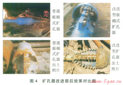 2)采用改進型板桶式擴孔器,提高了擴孔效率,降低了施工風險(圖4)。采用新擴孔器后,在Æ711mm-B管道穿越四級擴孔施工中均是一次性完成了擴孔,出土后的擴孔器磨損很小,擴孔效果極好。根據B管的擴孔經驗,在改進擴孔器切割方式的前提下,Æ711mm-A線進一步優(yōu)化了擴孔器水嘴的配置,使得鉆井液有效輔助切削,減小了擴孔扭矩,將原來的四級擴孔減少到三級(660.4mm、914.4mm、l066.8mm),提高了施工效率,節(jié)約了工期。