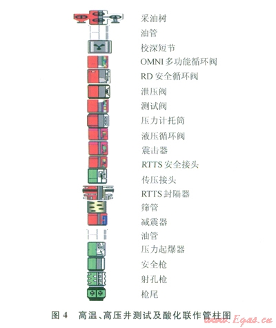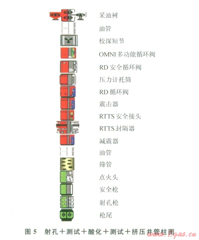 特點為:①管柱結(jié)構(gòu)簡單,安全適用,尤其是對于高溫高壓高產(chǎn)高含硫化氫的井況。②一趟管柱完成射孔、測試、酸化作業(yè),同時能進行擠壓井作業(yè),最大限度滿足安全需要??刹捎猛栋羯淇谆蛘吖苤鶅?nèi)加壓延時射孔的方式。③利于酸化前后效果對比。④可以進行地面開關(guān)井,終關(guān)井采用井下關(guān)井,利于取得真實反映地層情況的壓力恢復(fù)曲線。