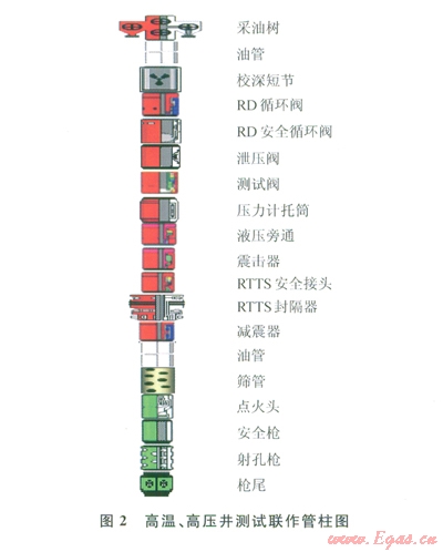 導(dǎo)向引鞋+射孔槍+點火頭+篩管+RTTS封隔器+安全接頭+液壓旁通閥+震擊器+壓力計托筒+LPR-N閥+放樣閥+RD安全循環(huán)閥+RD循環(huán)閥+校深短節(jié)+油管+采油樹(或井口控制頭)(圖2)。