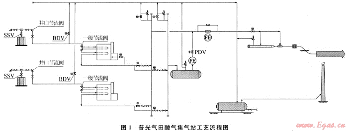 普光氣田集氣站的火炬有2種情況可能達(dá)到設(shè)計(jì)排放量,對照普光氣田集氣站工藝流程(見圖1[1])分析如下:
