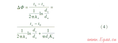 對于水平安裝供熱管道,設定絕熱層熱導率與方向無關且等于測點n方向的熱導率ln,根據(jù)式(3)與能量守恒定律,以測點所在圓為分界線,測點內(nèi)圓絕熱層與測點外圓絕熱層的熱流量相等。供熱管道單位長度熱損失DF可寫為: