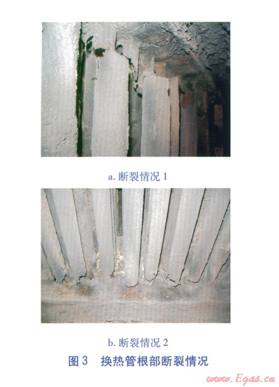 根據(jù)以上分析,課題小組選用抗腐蝕性能較高的ND鋼(09CrCuSb)對(duì)換熱管進(jìn)行改造,仍采用整體焊接的固定管箱式結(jié)構(gòu)。但改造后,5~10個(gè)月?lián)Q熱管根部再次出現(xiàn)了斷裂。不但使用壽命沒有有效延長(zhǎng),而且由于ND鋼的價(jià)格較高,導(dǎo)致成本急劇增加。