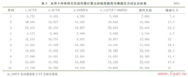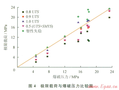 從圖4可以直觀地看}H:當(dāng)管道缺陷最深處的平均Von Mises等效應(yīng)力達到極限拉伸強度l.0UTS時,計算出的管道極限載荷最接近真實爆破壓力值;當(dāng)Von Mises等效應(yīng)力等于0.8UTS、0.9UTS和0.5(UTS4-SMYS)時得到的極限載荷過于保守,都小于真實爆破壓力值;而當(dāng)達到塑性失穩(wěn)時,得到的極限載荷值部分大于真實爆破壓力,具有不安全性。