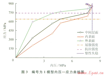 圖3為l0組爆破試驗有限元計算的內(nèi)壓應(yīng)力曲線圖(以編號為l模型為例),取中間節(jié)點的曲線做插值計算。分別計算當(dāng)中間節(jié)點的Von Mises等效應(yīng)力等于0.8UTS、0.9UTS、1.OUTS、0.5(UTS+SMYS)和塑性失穩(wěn)時的壓力值。