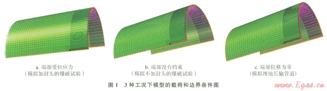 1)經(jīng)過分析可知,3種工況下管道兩端的約束各不相同:加封頭的爆破試驗管道兩端橫截面受軸向應(yīng)力;端部密封的爆破試驗的管道兩端可以忽略管道兩端所受的軸向應(yīng)力,近似認為不受約束;埋地長輸管道兩端沒有軸向應(yīng)力的約束,管道軸向位移為零。