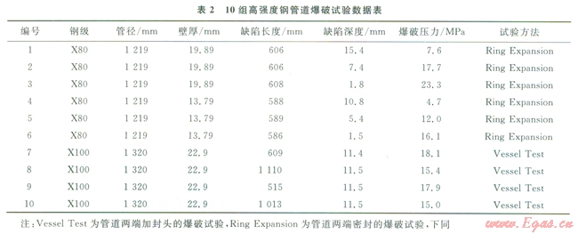 收集了10組含腐蝕缺陷的高強度管道的爆破試驗數(shù)據(jù),本試驗使用X80、Xl00高強度鋼材料[8-9],材料參數(shù)見表l。