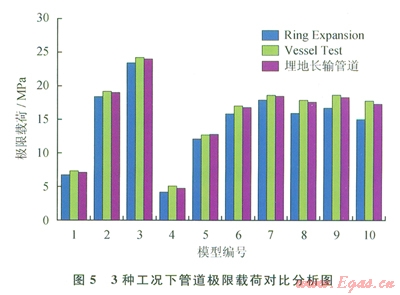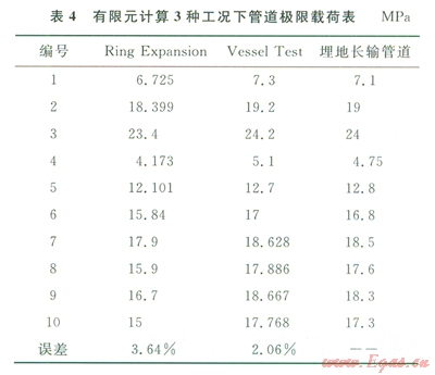 基于已確定的適合高強度管道的失效判據(jù),采用有限元分析方法模擬3種工況下管道的失效情況。圖5對3種情況下計算出的極限載荷做了對比分析。表4為3種丁況下管道極限載荷的對比值,通過對比分析可看出:加封頭的爆破試驗與埋地管道的預(yù)測極限載荷吻合度更高,l0組誤差的標(biāo)準(zhǔn)偏差值為2.06%;兩端密封的爆破試驗比埋地管道的預(yù)測極限載荷要小,l0組誤差的標(biāo)準(zhǔn)偏差值為3.64%。在實際工程試驗中,建議用加封頭的爆破試驗來預(yù)測埋地管道的極限載荷;用兩端密封的爆破試驗來預(yù)測真實埋地管道的失效情況,得到的預(yù)測結(jié)果偏保守。