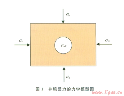 任何一口油氣井鉆開前原地應力就已存在于地層巖石中,油氣井眼鉆開后,井內流體壓力取代了被鉆巖層提供的支撐,無疑會引起井眼周圍巖石應力的重新分布[21-22]。假設井眼周圍的地層為多孔彈性介質,其應力分布可用以下力學模型求解:在無限大平面上,一圓孔受均勻的內壓,而在這個平面的無限遠處受兩個水平地應力的作用,在垂直方向上受上覆巖層壓力作用,如圖l所示。由于井周地層應力最大的點出現(xiàn)在井壁上[23],筆者僅給出了井壁上的應力分布公式。直井井壁圍巖有效應力為[23]