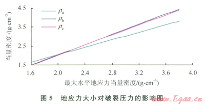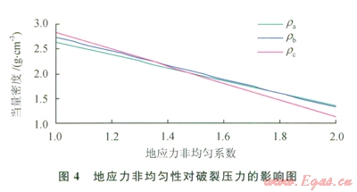 73種破裂壓力隨孔隙壓力的變化規(guī)律,計算時保持構造應力系數(shù)不變,只改變孔隙壓力的大小。當?shù)貙涌紫秹毫Ξ斄棵芏扔?span lang="EN-US">l.0gcm3 上升到2.0gcm3時,3種破裂壓力都近似呈線性增大,但rc增長速率遠小于rarb;當孔隙壓力當量密度小于1.5gcm3時,井壁首先發(fā)生A型剪切破裂;當孔隙壓力當量密度大于1.5gcm3時,首先發(fā)生拉伸破裂,即孔隙壓力越大發(fā)生拉伸破裂的可能性越大。