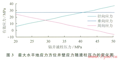 2給出了某深度處井壁上的應力分布。可以看出周向應力在最大水平地應力方位最小,此時,sr-sqsz-sq的值也都達到最大。圖3給出了q0°q=180°時井壁上的有效主應力隨井內鉆井液壓力的變化情況:隨著液柱壓力的升高,周向應力在不斷減小,當井筒液柱壓力超過29MPa時,周向應力成為最小主應力,且隨著液柱壓力的增加,垂向應力保持不變,徑向應力不斷增大,在周向應力達到井壁的拉伸強度前,若sr-sqsz-sq的值超過剪切破壞的強度極限,就有可能發(fā)生剪切破壞。