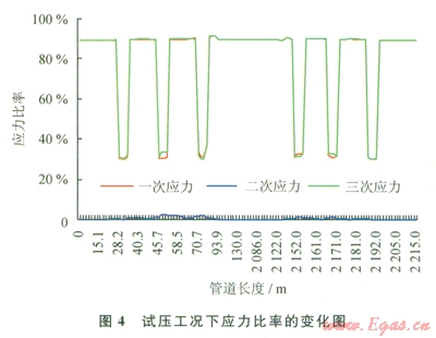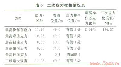3)一次應力占管道綜合應力的97.12%,故占管道應力的大部分。同時,在管道自重對一次應力影響的校核中,管道自重占一次應力的8.9%,所占比例較小。因此,管道內(nèi)壓是產(chǎn)生一次應力的主要因素。在一次應力校核中發(fā)現(xiàn)應力集中點在管道彎管3處,由于一次應力反映的是管道內(nèi)壓和管道以及管內(nèi)介質(zhì)的自重對管道應力的影響,因此,在試壓工況下,影響管道應力的最主要因素是管道內(nèi)壓。