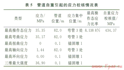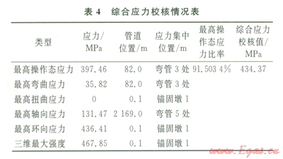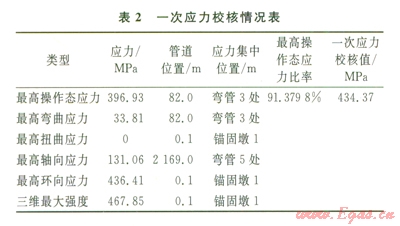 由表2~5可知,最高操作態(tài)綜合應力產(chǎn)生在管道彎管3處,管道系統(tǒng)單元l70~180即管道76~82m處的最高操作態(tài)應力為397.46MPa,最高操作態(tài)應力比率為91.5034%,綜合應力主要產(chǎn)生在彎管3處,一次、二次應力及綜合應力校核最高節(jié)點應力均未超過434.37MPa,滿足管道的強度和柔性要求。