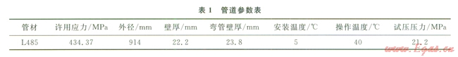 以XX隧道穿越管道為例,根據(jù)SY/T0015.1-1998《原油和天然氣輸送管道穿跨越工程設計規(guī)范穿越工程》6.2.2計算得到管道的試壓壓力為21.2MPa,試壓介質(zhì)為清水,試壓溫度為20℃,輸氣管道的工作溫度為40℃,建立試壓工況下的應力分析模型。表l為該管道的參數(shù)表。