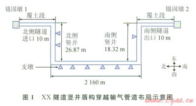 根據(jù)XX隧道穿越管道設計資料,隧道穿越的總長度為2246.7m,隧道內(nèi)全部采用露空與管架支撐形式,在隧道進口和出口處分別設置錨固墩l和錨固墩3,用以截斷隧道外管道對隧道內(nèi)管道的影響。隧道進口豎井深度為26.87m,支吊架2個(第1個支吊架距隧道進口處5.4m),2個支吊架間距為2.816m;平巷長度為2160m,平巷內(nèi)設置支墩,支墩間距為l2m,共設置支墩l81個;隧道出口豎井深度為18.32m,支吊架l個(距隧道出口處6.624m);管道彎管處的曲率半徑為6D(D為管道外徑)。管道的材料為L485,管徑為914mm,壁厚為22.2mm,彎管壁厚為23.8mm。根據(jù)式(1)計算得到試驗壓力(pt)為21.2MPa。XX隧道豎井盾構穿越輸氣管道具體布局如圖1所示。