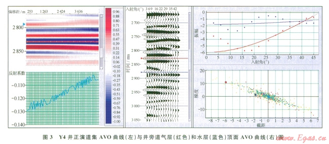 為了確定該氣田的AVO類型,首先從理論出發(fā)統(tǒng)計(jì)了井上的氣層及上覆地層的屬性參數(shù),包括縱橫波速度、密度、泊松比等參數(shù),并通過(guò)Shuey’S的簡(jiǎn)化Zoeppritz方程計(jì)算了反射系數(shù),發(fā)現(xiàn)氣層頂面的反射系數(shù)大,而泊松比變化較小[15],滿足產(chǎn)生第類異常的條件;接著選擇代表性的井(Y4)進(jìn)行了正演模擬,模擬結(jié)果顯示該井正演道集的氣層頂面均對(duì)應(yīng)波谷(負(fù)反射系數(shù)),并且隨著偏移距的增加振幅逐漸減弱(3);隨后對(duì)Y4井旁的實(shí)際地震道集進(jìn)行了AVO分析(網(wǎng)3),從實(shí)際道集中提取的氣層頂面AVO曲線表明:在偏移距2004500 m的變化范圍內(nèi),反射系數(shù)均為負(fù)值,并且其絕對(duì)值隨著偏移距的增大而減小,與正演模擬結(jié)果吻合,證實(shí)了該氣藏的IVAVO特征。