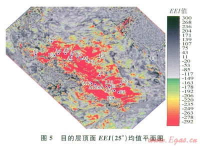 5為從反演得到的EEI(25°)屬性沿目的層頂面開(kāi)l0ms時(shí)窗提取的算術(shù)平均值平面圖,圖中綠色到紅色對(duì)應(yīng)EEI值小于-l50,并且顏色從綠色到紅色對(duì)應(yīng)的EEI值逐漸降低。結(jié)合本區(qū)的鉆井情況和構(gòu)造形態(tài)可知,圖5中紅色異常范圍(EEI值小于-150的范圍)與該層鉆井證實(shí)的含氣范圍吻合好。在EEI屬性平面圖上,鉆遇水層的E9井處EEI屬性表現(xiàn)為水層特征,而其他含氣性好的井則對(duì)應(yīng)相對(duì)低的EEI值,這說(shuō)明利用EEI屬性能有效地區(qū)分出氣層和水層。另外,A9井區(qū)物性較好的位置主要集中在構(gòu)造高部位,即A9井的周圍,但是分布的范圍較小,這可能就是A9井生產(chǎn)過(guò)程中壓力下降較快的一個(gè)原因。